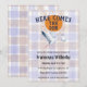 Este convite de chá de bebê editável apresenta uma adorável cegonha ilustrada voando à frente do sol brilhante boho. O fundo é um suave xadrez em aquarela. Cores usadas: 005 Íris e 013 Chocolate