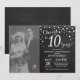 10º Aniversário de Casamento com foto personalizada. Convite de Quadro de Giz Preto e Prata. Décimo Aniversário de Casamento. Fundo de Diamante Brilhante Preto e Prata. Confetes Prata. Aniversário de Adulto. Festa de Aniversário de Homem ou Mulher. Para personalização adicional, clique no botão "Personalize" e use nossa ferramenta de design para modificar este modelo.