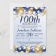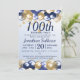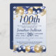Um na moda 100º convite de aniversário. Design apresenta balões azuis e dourados marinhos, início Dourado da brilha e texto azul marinho tudo em um plano de fundo azul claro. Um design adorável convidando seus hóspedes para se juntar a vocês para uma centésima festa de festa de aniversário. Fácil de personalizar com os detalhes do seu próprio partido.