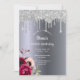 Na frente: Um convite para uma 100ª festa de aniversário. Um fundo metálico de aspecto prateado escuro. Decorado com púrpura escura e flores cor-de-rosa-burro e rosa, brilho fino prateado, aparência de pingar tinta. Modelos para um nome e detalhes da festa. O nome é escrito com um script de estilo manuscrito, letras coloridas de cinza clara. Traseira: fundo metálico prateado e gotejamento com brilho.