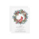 An elegant red cardinal nestled in a winter greenery wreath invites guests to your winter or Christmas birthday party. The watercolor design features a beautiful cardinal and a pine wreath decorated with red flowers and berries along with pine cones.