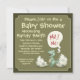 Um convite do chá de fraldas dos desenhos animados com a imagem de um dinossauro e de um texto do bebê dos desenhos animados que indicam o chá de fraldas junto com blocos de texto customizáveis para detalhes do próximo evento.