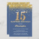 Surpresa 15 de Aniversário Azul e Dourado Confetti Convite de Aniversário. Para mais personalização, clique no botão "Personalizar" e use nossa ferramenta de design para modificar este modelo.