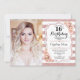 16º convite de aniversário com sua foto. Pode ser personalizado para mostrar qualquer idade. Apresenta faixas, fonte de script, rosas cor-de-rosa pinceladas e confetti. Design clássico com ouro de rosa brilhante falso. Perfeito para uma elegante celebração do décimo sexto dia.