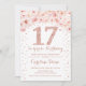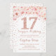 17º Convite de aniversário. Design elegante em ouro rosa e branco. Possui rosas cor-de-água pinceladas rosa, confetti e diamantes. Perfeito para uma comemoração de vidro.