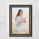 Quer amigos e familiares estejam praticando distanciamento social ou simplesmente vivam longe, conectem-se com eles online com uma festa de formatura virtual na moda. (DICA DE IMAGEM: Uma maneira fácil de centralizar uma foto exatamente como você deseja é recortá-la antes de carregá-la no site do Zazzle.) Esse convite moderno a preto e ouro permite compartilhar uma foto e convidar convidados para um evento a longa distância por meio de videoconferência com zoom, streaming ao vivo da Internet ou um jogo de realidade virtual. Todo texto também é simples de personalizar para uma parada de carro de graduação de drive-by ou drive-through. Se apenas um cartão de anúncio for preferido, basta mudar o texto para incluir qualquer detalhe de sua escolha, como nomes de pais, honras especiais, título de grau, planos futuros de formando e informações de contato, ou citação de inspiração favorita. O Modelo também pode incluir uma mensagem pessoal se este for um evento reagendado devido a um cancelamento ou adiamento. Se houver algum texto não desejado, simplesmente exclua-o. Design apresenta um fundo preto, folha metálica falsa, tipografia moderna na moda, caligrafia de script manuscrita e uma foto de sua escolha, como uma fotografia de mais velho ou imagem da cerimônia de inauguração. Por favor, note que o ouro é impresso a cor, não a folha real. Esta carta elegante é uma maneira chique de começar sua celebração especial. Parabéns ao formando!