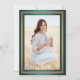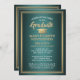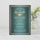 Convide a família e os amigos a um segundo grau elegante ou a uma festa formandos com estes convites metálicos verdes, brancos e de ouro suave. Foto e texto são simples de personalizar. (DICA DE IMAGEM: Uma maneira fácil de centralizar uma foto exatamente como você deseja é recortá-la antes de carregá-la no site do Zazzle.) Este modelo de convite é formatado para uma festa de formatura, mas pode ser facilmente alterado para uma casa aberta ou qualquer tipo de evento. Se apenas um cartão de anúncio for preferido, basta mudar o texto para incluir quaisquer detalhes de sua escolha, como nomes de pais, quaisquer honras especiais, título de grau, planos futuros de formando e informações de contato, ou citação inspiradora favorita. Design apresenta um fundo de aço inoxidável esfregado, boné de formatura de folha de alumínio dourado, tipografia moderna na moda, caligrafia de escrita manual e uma fotografia da sua escolha, como uma fotografia de mais velho ou imagem da cerimônia de início. Este cartão de na moda é uma maneira chique de começar sua celebração especial. Parabéns ao formando!
