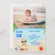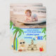 Este belo convite de aniversário para meninos da praia FOTO mostra um bebê adorável na praia bebendo seu auxílio de limão. Ele está parado com seu caranguejo, um castelo de areia impressionante e seu prato de surfe, todos cercados por palmeiras tropicais. Adicione uma foto à frente e atrás deste convite.