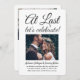 Convide familiares e amigos para uma celebração de casamento simplesmente elegante com este convite de casamento moderno e sofisticado "At Last Let's Celebrate" com 2 fotos. Toda a redação é simples de personalizar para qualquer tipo de evento, incluindo uma festa de recepção após um casamento íntimo, cerimônia de renovação de votos, segundo casamento, recepção de 1º aniversário, hora do coquetel ou jantar. Personalize-o para incluir os detalhes de sua escolha, como data do casamento, código de vestimenta, RSVP, site, etc. (DICA DE COLOCAÇÃO DE IMAGEM: Uma maneira fácil de centralizar uma foto exatamente como você deseja é cortá-la antes de fazer o upload para o site da Zazzle.) O design moderno minimalista preto e branco apresenta duas fotos do casal recém-casado, caligrafia de script manuscrita trendy e tipografia elegante no estilo de máquina de escrever. Se você fugiu, teve um minimônial menor ou microcasamento, ou a celebração do seu dia especial teve que ser remarcada devido a um adiamento relacionado à pandemia de covid, a festa feliz para sempre ainda pode começar