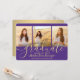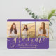 Compartilhe a alegria de um segundo grau ou formandos e convide a família e os amigos a celebrarem com estes convites personalizados de três colagens de fotos, roxo e ouro. Todas as imagens e textos são simples de personalizar. (DICA DE IMAGEM: Uma maneira fácil de centralizar uma foto exatamente como você deseja é recortá-la antes de carregá-la no site do Zazzle.) Este modelo é formatado para uma festa de formatura, mas pode ser facilmente personalizado como um convite ou um cartão de anúncio de casa aberta. Simplesmente mude o texto para incluir quaisquer detalhes de sua escolha, como nomes de pais, honras especiais, título de grau, citação de inspiração favorita, planos futuros de formandos ou novo endereço. Se houver algum texto não desejado, simplesmente exclua-o. Design apresenta um fundo roxo, boné de conselho de morteiro de folha falsa, caligrafia de script manuscrita, tipografia moderna minimalista e três fotos de sua escolha, como fotos de mais velho ou imagens da cerimônia de início. Observe que o ouro é impresso a cor, não a folha metálica. Esta elegante carta de convite para a formatura é uma maneira moderna e chique de começar a sua celebração especial. Parabéns ao formando!