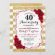 Convite de festa de aniversário de casamento de 40 anos vermelho rubi. Cartão de convite elegante vermelho, branco com dourado brilhante falso. Apresenta listras elegantes, fonte manuscrita e rosas vermelhas. Perfeito para uma celebração de 40º aniversário.