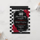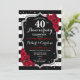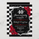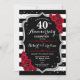 Convite de festa de aniversário de casamento de 40 anos vermelho rubi. Cartão de convite elegante vermelho, preto e branco com falso brilho prateado. Apresenta listras pretas e brancas elegantes, fonte script e rosas vermelhas. Perfeito para uma celebração de aniversário de 40 anos.