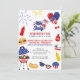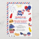 Convite para o CHURRASCO da celebração do dia 4 de julho - fácil de editar a redação para incluir as vantagens do partido e quaisquer informações adicionais, como diversão por sol comida ou cervejas e hambúrgueres; trazer um prato lateral, faísca, cadeira de jardim, etc. A design apresenta balões e fogos de artifício, comida de churrasco, sobremesas e óculos de sol legal. Tem um tema patriótico de cor branca vermelha e azul com muitas estrelas e listras.