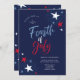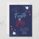 O Convite de festas Red White Blue Fireworks de 4 de julho apresenta estrelas vermelhas, brancas e azuis, juntamente com detalhes de fogos de artifício e caligrafia moderna.