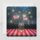 Os faíscas irradiam brilhantemente de um frasco adornado com pequenas bandeiras americanas, colocado em uma toalha vermelha e branca de mesa. Todo o texto pode ser alterado.