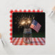 Sparklers in a glass jar illuminate the scene alongside a small American flag set against a red and white checkered tablecloth.