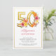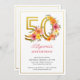 50º convite de aniversário com o número 50 de ouro decorado com flores bonito. Design feminina e elegante com arranjos florais de aquarela em tons de laranja amarelo rosa e roxo. Perfeito para comemoração de 50 anos, almoço de aniversário de primavera ou verão, festa de chá de jardim etc.
