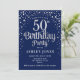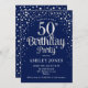 50º Convite de aniversário. Design elegante em azul marinho escuro e prata brilhante fraca. Possui fonte de script na moda e confetti. Envie-me uma mensagem se precisar de idade personalizada.