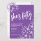 Elegante 50º Convite de aniversário Roxo 50º. Um divertido, mas elegante, 50º convite de aniversário com flores roxas e brancas giras para os jovens de coração. Um padrão de flores brincalhão enquadra uma tipografia de script "ela tem cinquenta anos" misturada com uma fonte mais clássica de serifa. Celebrar cinquenta anos de vida com esta bela design botânica. A parte divertida é que você pode mudar TODAS as cores! Você não só pode mudar as cores e a fonte de fundo, como também pode mudar as linhas das flores. Disponível como um convite impresso ou como um convite digital para download que você pode enviar por e-mail ou que foi impresso localmente!