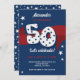 🎂 se juntar a nós para comemorar um patriótico aniversário de 50 anos! 🎈 Honrar um veterano ou militar com este convite de aniversário vermelho, branco e com tema azul. A design de captura de olhos exibe uma faixa vermelha de fita colocada sobre um fundo azul profundo, realçada por um número retrorativo branco em negrito 50 acentuado com recortes de estrelas. Este convite personalizado é perfeito para uma comemoração de aniversário de um marco cheio de orgulho patriótico. Faça seu amado se sentir especial com este convite para o partido americano! 🇺 🇸