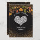 Convites de festa de aniversário de 50 anos de casamento com diamantes e dourado elegantes - bordas com brilho dourado falso na parte superior e inferior. No centro, um coração de diamantes falsos. A parte superior é adornada com folhas de outono e desenho de guirlanda de bagas em cores clássicas de outono. Lê-se '50 Anos Juntos' acima do coração em letras pretas elegantes e curvas. Nomes do casal abaixo em letra cursiva bonita com uma borda de pergaminho. Fundo preto. O verso tem fundo preto e brilho dourado coordenado com detalhes personalizados da festa de aniversário de casamento em dourado. Nota: Todas as imagens são impressas. Não são gemas ou brilho reais. Use o botão Personalizar para alterar qualquer coisa - estilos de fonte, tamanhos, cores ou posicionamento. Belos convites de celebração de aniversário de