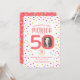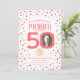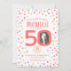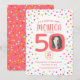 Bright colorida confetti aleatoriamente pontos aleatórios aniversário 50 convites de festas surpresa. Em coral vivo, rosa quente, amarelo ouro e verde azul aqua. Adicione a sua foto de aniversariante no centro do 0 em 50 e personalize com sua própria data de aniversário, hora e detalhes da festa. Coral vivo com pontos aleatórios por todo o padrão ao contrário. Outros itens correspondentes e anos de aniversário de marco disponíveis. Design original por www.mylittleeden.com no zazzle.