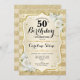 50º Convite de Aniversário. Design floral elegante em ouro e branco. Apresenta fitas de ouro com brilho sujo, fontes de na moda de rosas brancas e confetti. Perfeito para uma festa de aniversário de vidro.