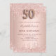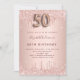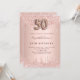 Um convite moderno, na moda e glamouroso para a 50ª festa de aniversário. Um fundo rosa de ouro falso com pingos, pintura com pingos. O nome é escrito com um moderno e escuro, rosa dourado, escrito com letra de estilo manuscrito. Personalize e adicione os detalhes da sua festa. O número 50 é escrito com uma fonte de estilo balão, script.