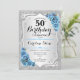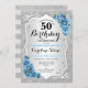 50º Convite de Aniversário. Design floral elegante em prata e azul gelado. Possui riscas prateadas com brilho inverso, fonte de script na moda e confetti rosa de de de turquesa. Perfeito para uma festa de aniversário de vidro.