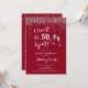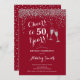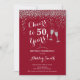 50º Convite de Aniversário. Saúde Para 50 Anos! Design elegante em vermelho, branco e prata. Apresenta óculos de champanhe, fonte de script e confete prateado brilhante. Perfeito para na moda 50 festas de aniversário. Personalize com seus próprios detalhes. Pode ser personalizado para mostrar qualquer idade.