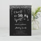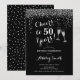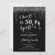 50º Convite de Aniversário. Saúde Para 50 Anos! Design elegante em preto, branco e prata. Apresenta óculos de champanhe, fonte de script e confete prateado brilhante. Perfeito para na moda 50 festas de aniversário. Personalize com seus próprios detalhes. Pode ser personalizado para mostrar qualquer idade.