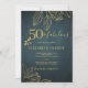 A elegante vintage de luxo inspirou o modelo de 50º convite de aniversário com folhas de ouro, folhagem e falso roteiro de tipografia de ouro em um fundo de tábua azul-escuro, antiga, azul, em relevo. — O convite é adequado para todas as estações festas de aniversário de marcos clássicos - 30, 40, 50, 60, 70, 80, 90, 100 - ou outras comemorações de aniversário. +++++++++++++ É totalmente editável e fácil de personalizar com seus detalhes!