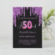Um convite de aniversário feminino e feminino 50 e fabuloso. Na frente: Um fundo preto chic. Decorado com púrpura escura e púrpura pingando, pintura pingando aparência. Personalize e adicione um nome e detalhes da parte. O nome é escrito com um script de estilo manuscrito, letras claras e roxas. Idade: 50 anos com uma fonte do estilo do balão de tendência.