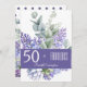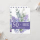 50 e Fabuloso 50. Convite de aniversário. Tela floral de lavanda moderna e elegante no canto com uma faixa roxa perto do fundo. Bolinhas roxas atrás. Data, local, RSVP incluído. Lavanda floral e spray floral suculento na parte posterior.