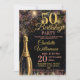A stylish 50th Birthday Party Invitation featuring a bottle of bubbly in gold, fireworks with gold and Pink text all on a black background . A gorgeous invitation to send to family and friends to celebrate a special birthday. All text can be amended as needed - more text can be added on the back or delete the text box if need needed.