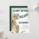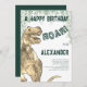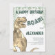 Celebre a criança que ama dinossauros com um rugido de dinossauros T-Rex convidando amantes de Dino a uma divertida festa de aniversário pré-histórica de dinossauros da selva Jurássica com este divertido convite moderno. Personalize este assustador Tyrannosaurus Rex em um convite da selva Jurássica adicionando o nome do aniversariante ou garota, o número do aniversário e os detalhes da festa e você está preparado para uma divertida e cheia de dinossauros verde-quente festa de aniversário dinossauro. Todas as espécies de dinossauros são bem-vindas. Época jurássica pré-histórica Ilustrações de dinossauro e folhagem, arte original de Catherine Sweetman