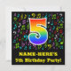 A frente deste design de convite de aniversário divertido, excitante e colorido apresenta um grande número "5" com um padrão inspirado no gradiente do espectro arco-íris, junto com um nome personalizado e a mensagem "Festa de aniversário 5!" Parte do fundo apresenta notas de música e padrões de símbolos divertidos e coloridos. A parte traseira apresenta detalhes/informações personalizadas sobre o evento para o qual os possíveis convidados estão sendo convidados. Cartões de convite de aniversário vibrantes e editáveis como este podem ser enviados a potenciais convidados de uma comemoração sendo realizada para honrar o aniversário de 5 de alguém. [~Z0000427]