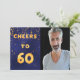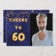 Um convite de aniversário 60º de tendências. Com o texto: até 60 na frente, escrito com letras falsas de balões de ouro. Fundo azul escuro, a cor azul é irregular. Com ouro confetti. Modelo para sua foto. Adicione os detalhes do evento no verso. Letras brancas, fundo azul.