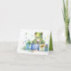 Feliz sapo Verde de Aniversário, sentado sobre a pilha com presentes embrulhados