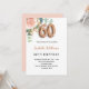 Um convite elegante para uma 60ª festa de aniversário. Um fundo branco chic. Decorados com um rosa de ouro e rosa cor-de-rosa-esbranquiçada, folhas de eucalipto florais, verdes, galhos, verde e borras de ouro. Personalize e o nome e os detalhes da festa. Letras pretas e ouros. O nome é escrito com um moderno estilo escrito à mão. O número 60 é escrito com uma fonte no estilo do balão de ouro. Traseira: cor de fundo rosa dourada.