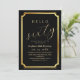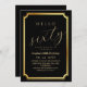 Modern stylish birthday party invitation black with gold dust on with a gold ink pour effect (the gold is a digital effect, not real foil) and modern calligraphy. Classy and elegant, simple and modern invitation.