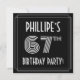 The front of this elegant sixty-seventh birthday celebration/party invitation card design features an editable name, an intricate art deco look inspired number “67th”, the message “BIRTHDAY PARTY!”, and a multi-line border. There is a black-colored background on the front by default, but it can be customized to a different color if desired. The back features personalized details about the event, such as the date, time, location, and any other important information. Elegant, stylish, editable invitations like these might be used to invite guests to a birthday party being held in celebration of somebody’s 67th birthday. [~Z0000615]