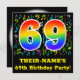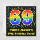 A frente deste design de convite de aniversário divertido, excitante e colorido apresenta um grande número "69" com um padrão inspirado no gradiente do espectro arco-íris, juntamente com um nome editável e a mensagem "69ª Festa de aniversário!" Parte do plano de fundo apresenta um padrão divertido de várias notas e símbolos de música com várias cores e tamanhos. A parte traseira contém informações/detalhes personalizados relacionados ao evento para o qual os possíveis convidados estão sendo convidados. Cartões de convite de aniversário felizes e editáveis como este podem ser usados ao convidar hóspedes para comparecer a uma comemoração realizada para honrar um músico, um cantor, um compositor de música ou o 69º aniversário de alguém. [~Z0000427]