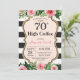70º Convite de Café Alto para mulheres. Convite de Aniversário Preto e Dourado. Brilho Dourado. Flor Floral de Aquarela Rosa. Listras Pretas e Brancas. Digital Imprimível. Para personalização adicional, clique no botão "Personalize" e use nossa ferramenta de design para modificar este modelo.