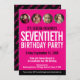 Convite de 70 de aniversário de modelo de foto unisex preto e branco, simples e preto, rosa quente gráfico a quente e preto. Personalize este convite de aniversário milestone com seus próprios detalhes de evento de festa de aniversário, e quatro fotos diferentes de sua aniversariante nos círculos fotográficos. Outras cores de anos e itens correspondentes estão disponíveis. © Original design por Sarah Trett para www.mylittleeden.com no Zazzle.