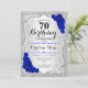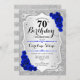 Convite de aniversário de 70. Design floral elegante em prata e azul real. Apresenta fitas cintilantes de prata, fontes de script na moda e confetti de rosa de de safira. Perfeito para uma festa de aniversário de vidro.