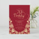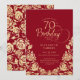 Convite de aniversário 70 de ouro vermelho elegante. Design clássico com rosas, folha de ouro falsa e letra de script de tipografia. A Trendy convida o cartão perfeito para uma festa de na moda. Personalize com seus próprios detalhes. Pode ser personalizado para qualquer idade. Impressos convites Zazzle ou modelo de impressão digital instantânea para download.