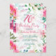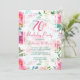Este convite de aniversário floral tropical apresenta lindas peônias e rosas em tons de rosa e roxo, com verde teal atrás de uma camada de branco, com uma estrutura recortada para os detalhes do seu partido em tipografia rosa e lacrimogênea. Um grande "70" em cor-de-rosa-menina com aspersores é o ponto focal. A parte traseira do cartão tem um padrão floral correspondente. Desenhada pela artista Susan Coffey.