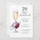 Um na moda moderno 70 e uma festa de aniversário sensacional com um vidro de champanhe floral, um borrão de brilho falsa na parte traseira do cartão e a tipografia rosa e preta da caligrafia.