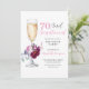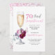 Um na moda moderno 70 e uma festa de aniversário sensacional com um vidro de champanhe floral, um borrão de brilho falsa na parte traseira do cartão e a tipografia rosa e preta da caligrafia.